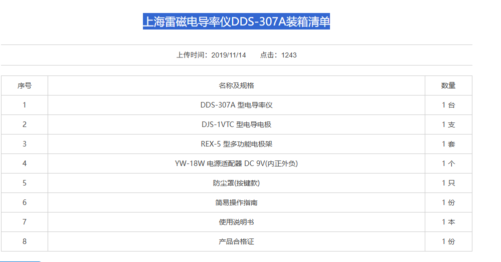 上海雷磁電導(dǎo)率儀DDS-307A裝箱清單
